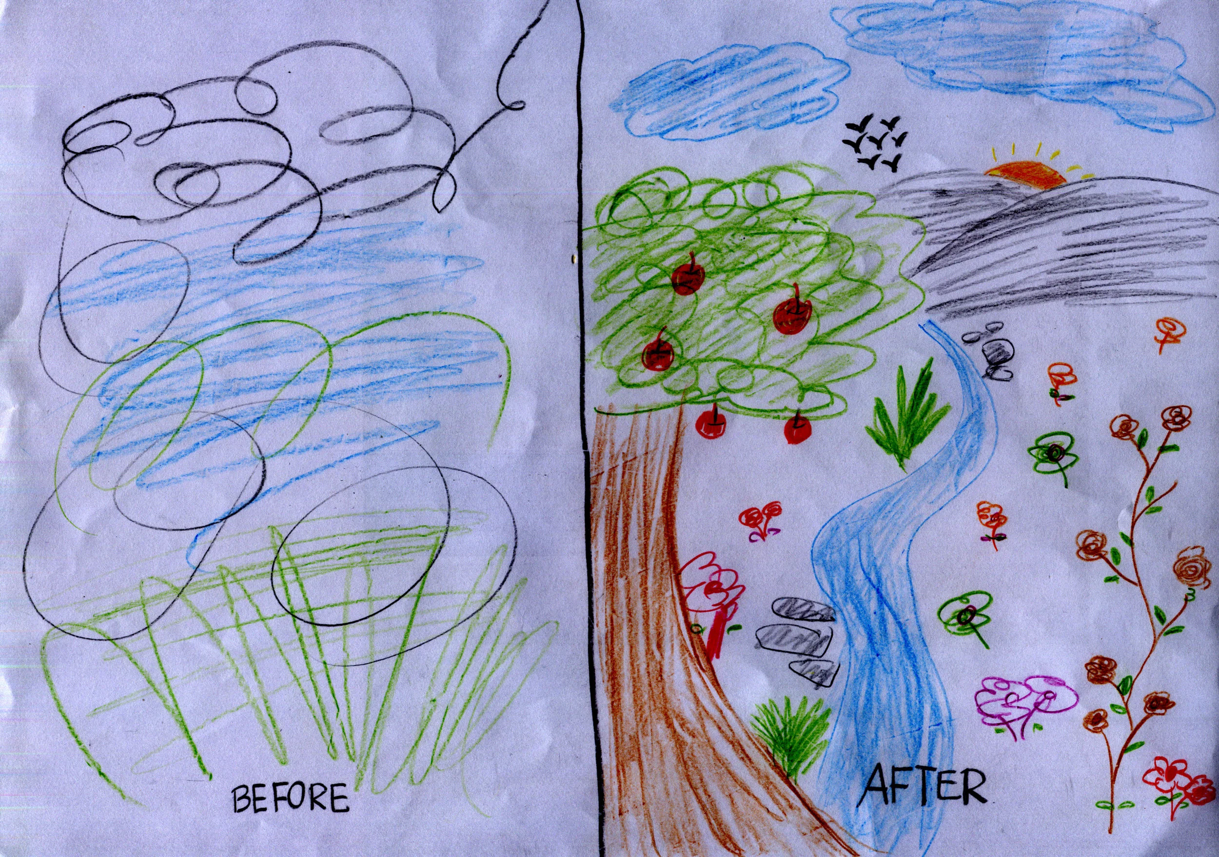 Art work from a mother who reflected on how she felt at the start and then at the end of a 10 week group intervention with Karin.